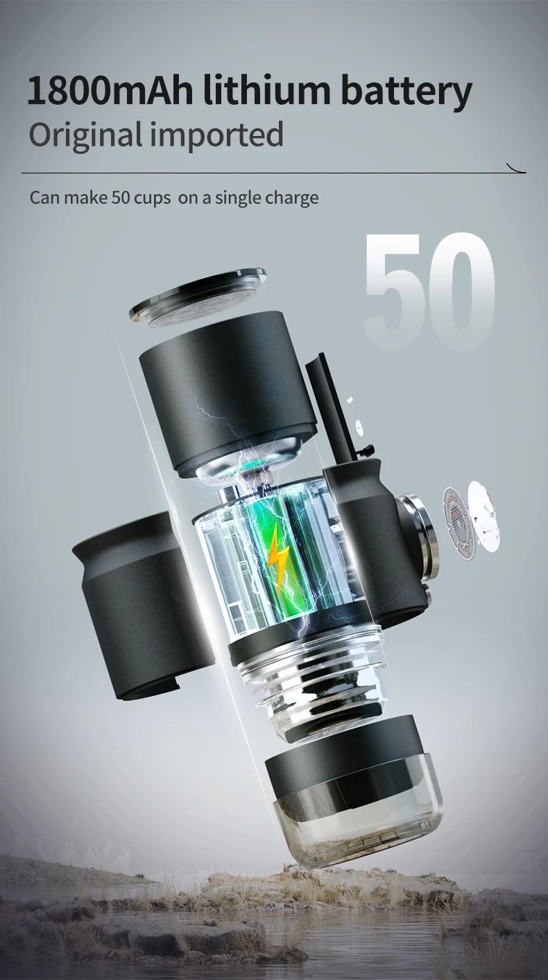 Premium Battery Capacity: The travel espresso machine is equipped with 1800mAh battery, compatible with 10-15W USB-C car charger for universal charging, brews 50+ cups with hot water.