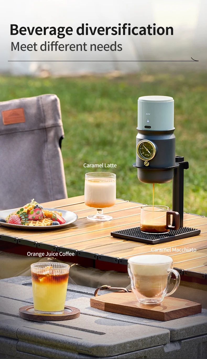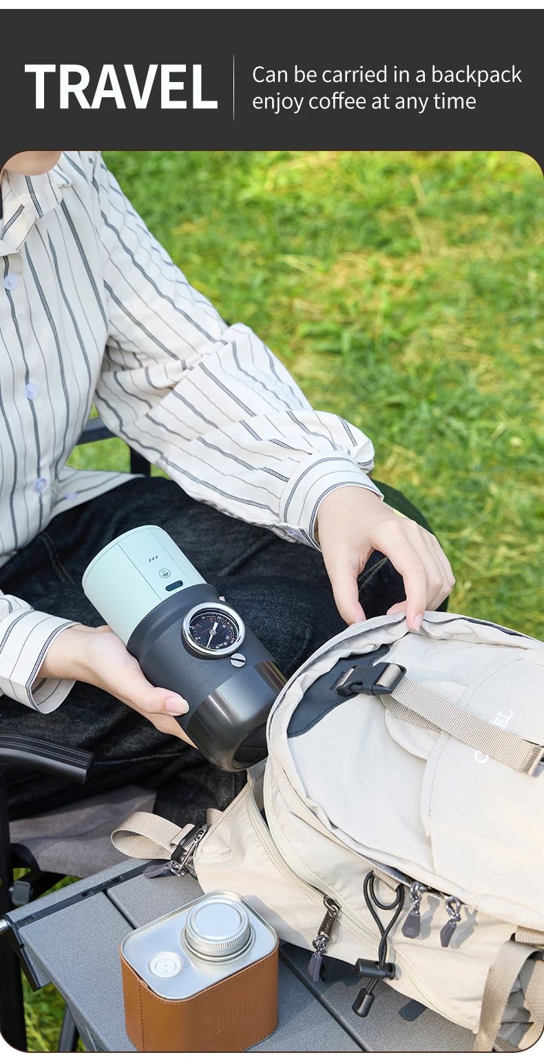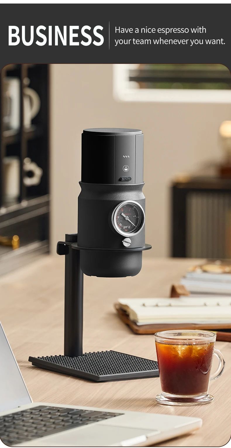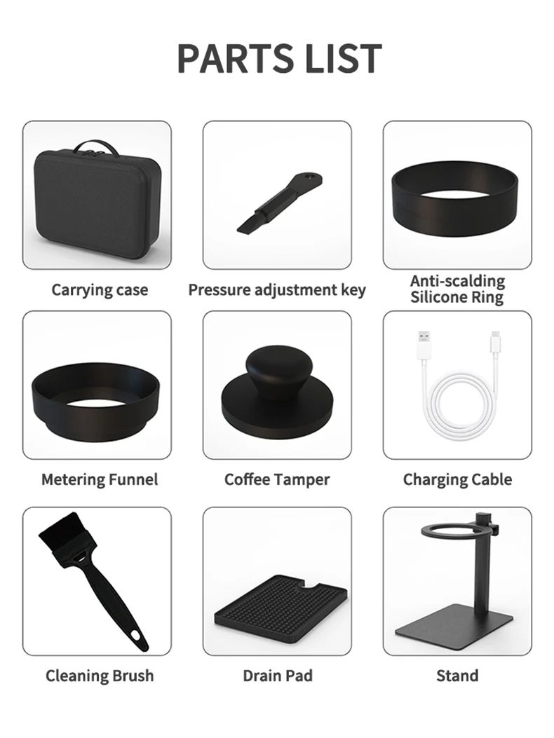 All-metal body: Super58 espresso machine is made of aluminum alloy, fully equipped with USB-C, stand, metering funnel, coffee tamper, silicone insulation sleeve and carrying bag, convenient for carrying out.